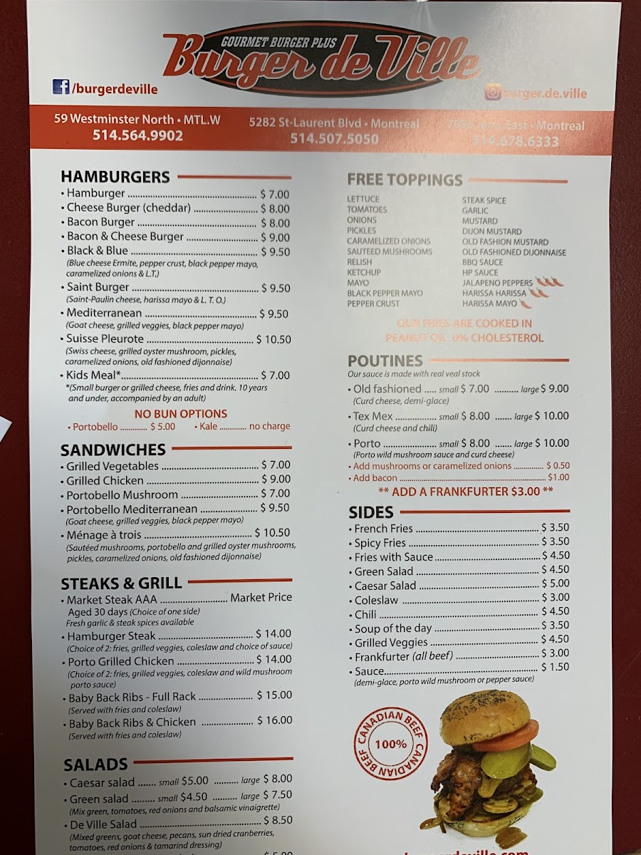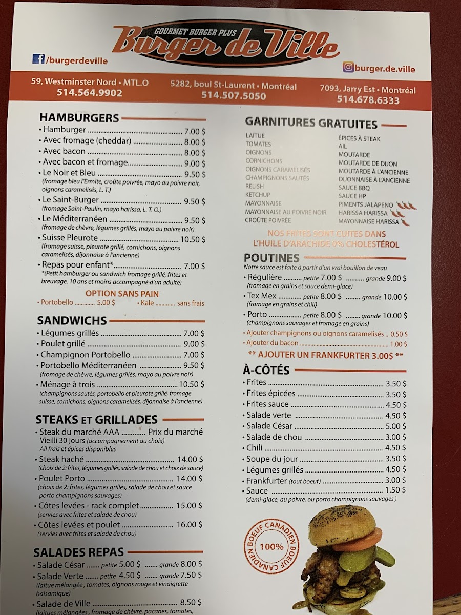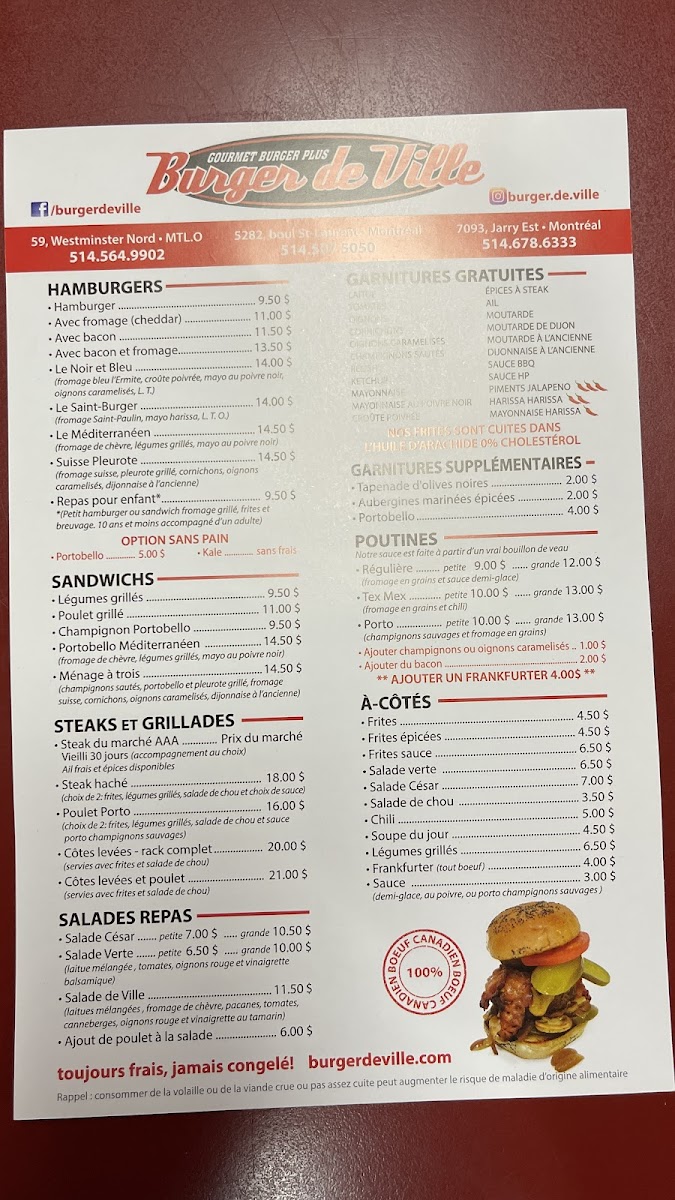 Welcome to Burger de Ville, a hidden gem located at 59 Westminster Ave N, Montreal West. This charming eatery offers a menu that expertly blends classic burger elements with gourmet twists. Here, the Steak Hache and Poulet Porto shine brightly, accompanied by your choice of two sides including spicy fries and grilled veggies. Each burger is grilled to perfection, boasting juicy patties and a delectable array of toppings.